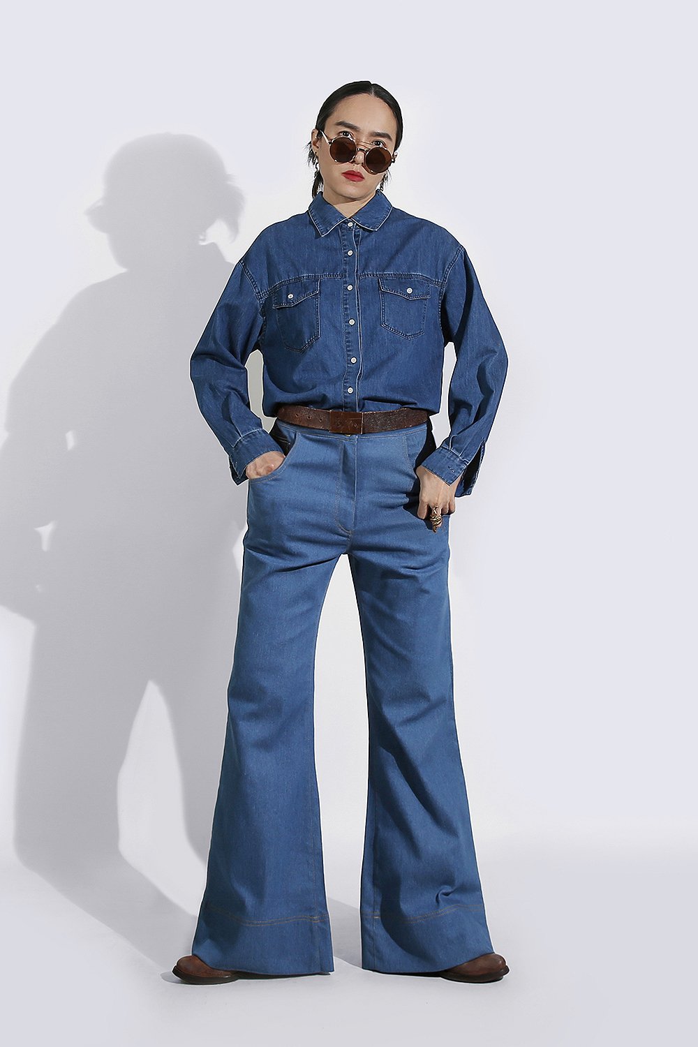 ✔️ กางเกงยีนส์ทรงขาบาน ที่ออกแบบโดยค่อยๆ ไล่ความกว้างพิเศษ ให้กว้างกว่าทรงขาม้า (Flare) แต่ไม่บานเท่าทรงขากระดิ่ง (Bell Bottoms)