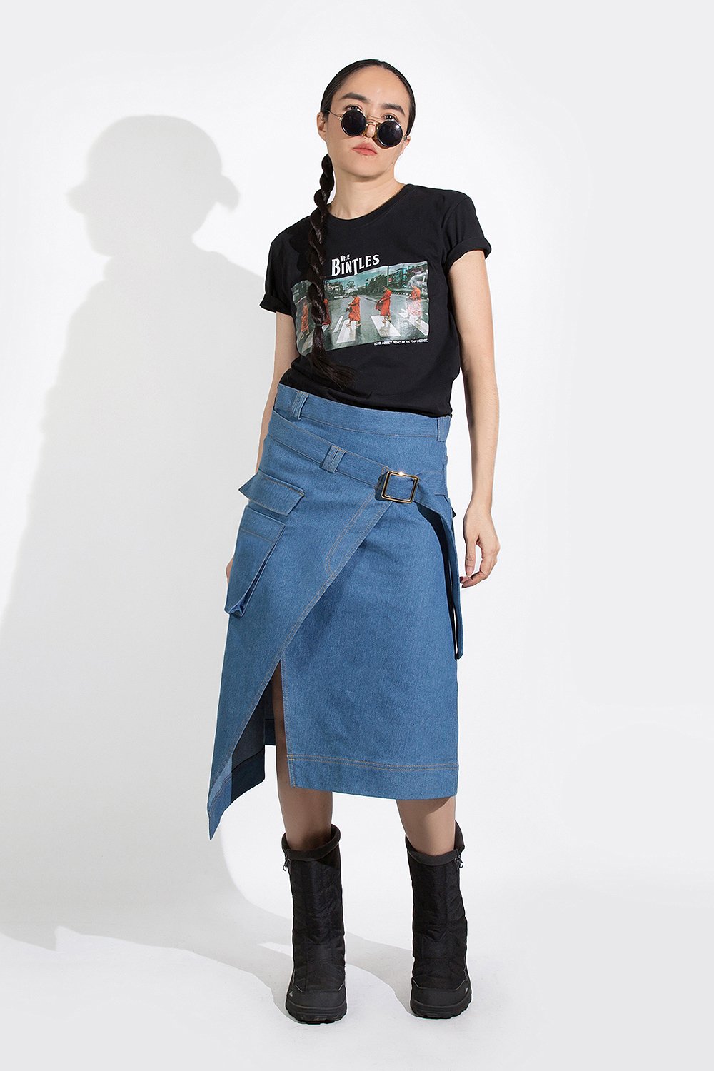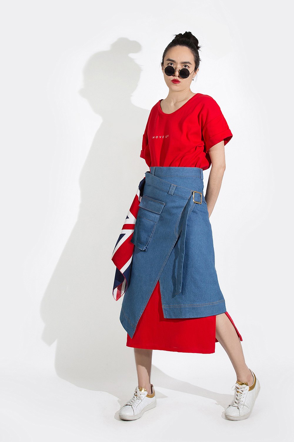 กระโปรงยีนส์ทรงป้าย สุดเท่ ดีไซน์ Asymmetric Cut (ไม่สมมาตร) ที่มาพร้อมความยืดหยุ่นแบบ freesize สามารถปรับใส่เข้า และขยายออกได้หลายนิ้ว ออกแบบมาให้ปรับใส่ได้หลายสไตล์ ไม่ว่าจะใส่เอวสูง เอวต่ำ ก็ลงตัวทุกมุม ตกแต่ง gimmick ด้วยเข็มขัดทองคุณภาพดี สุดเก๋ ป้ายหนังแท้ งานตัดเย็บพิถีพิถันโดยช่างบูติค สามารถนำไป Mix & Math ได้สารพัดลุค ตั้งแต่ใส่ทับกางเกงยีนส์ขาบาน Halo ตัวเก่ง (Jeans over Jeans) ไปจนถึงใส่เดี่ยวๆ หรือกับเดรสเรียบๆ สุดมินิมอล กระโปรงตัวเดียวที่บาลานซ์ความเท่ กับความเฟมินีนได้ลงตัวที่สุด