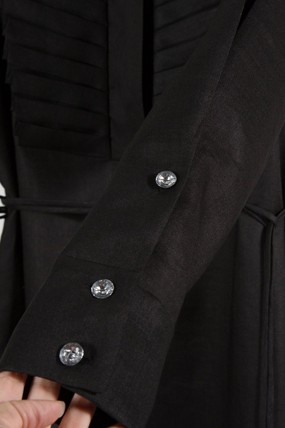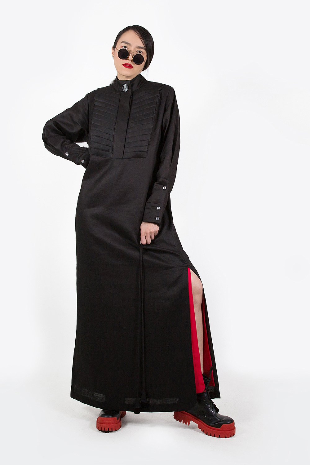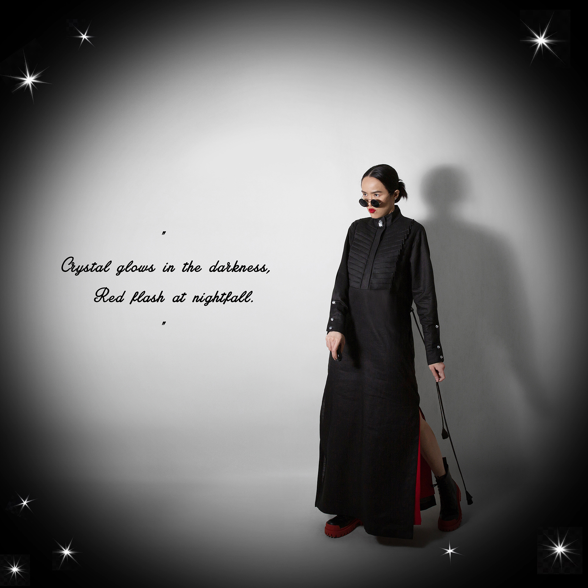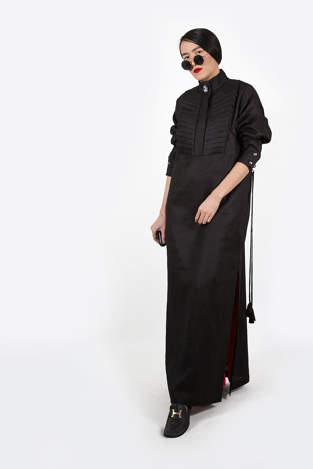 แม็กซี่เดรสทรงโคร่ง (ไม่เข้ารูป) ทรงเอนิดๆ ผ้าลินินแท้สีดำ (แต่รีดง่าย) คอตั้งทรงสูง ติดกระดุมคริสตัลทรงโอเวอร์ไซส์ วงรีเม็ดใหญ่ ช่วงหน้าอกตีเกล็ดวางเฉลียงสวยๆ แบบซ่อนตะเข็บ (เย็บมือ) แขนยาวดีไซน์เก๋ๆ แบบจับจีบไขว้ทบกัน โชว์ด้านติดกระดุมคริสตัลทรงกลม (ถอดออกได้)