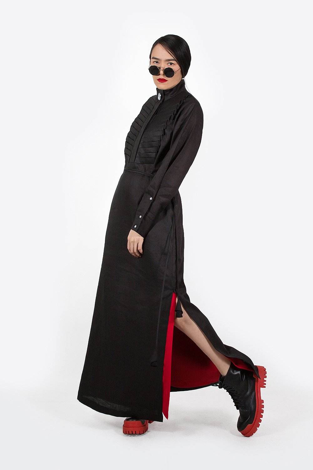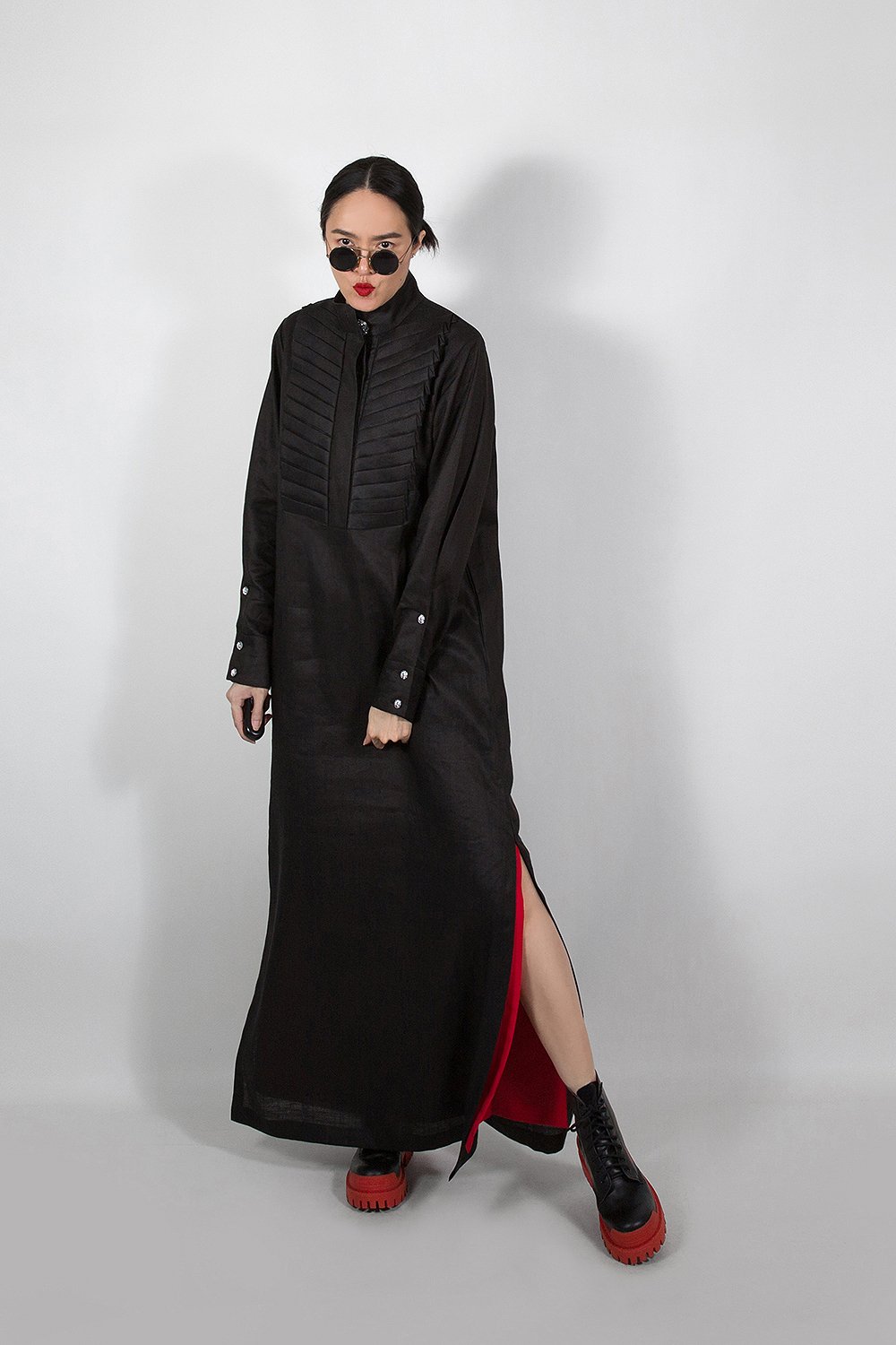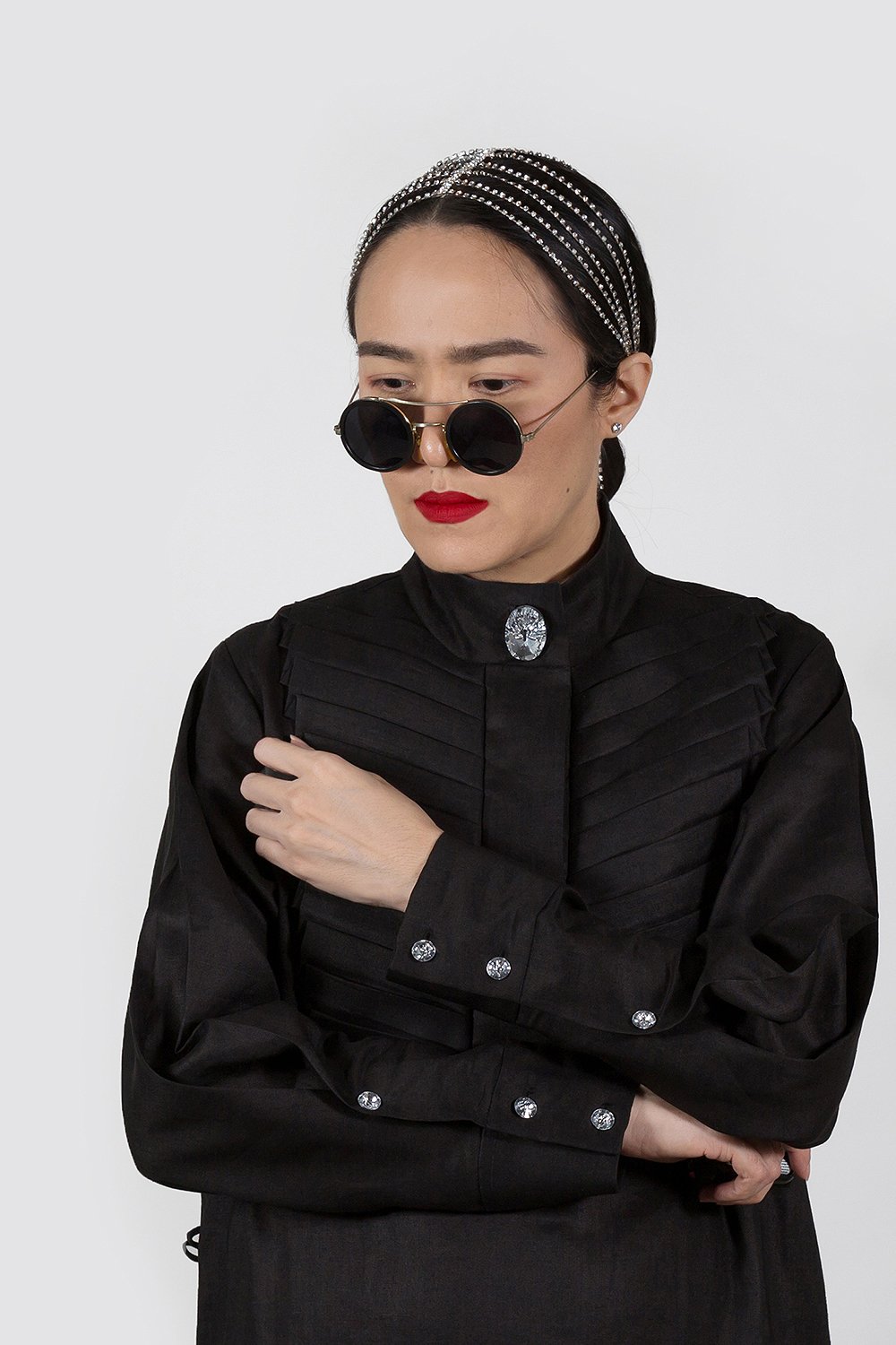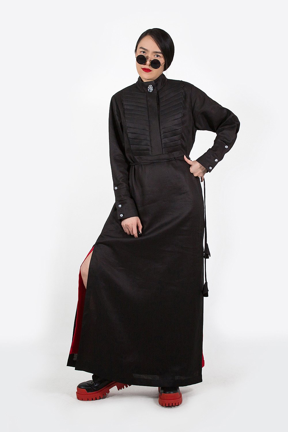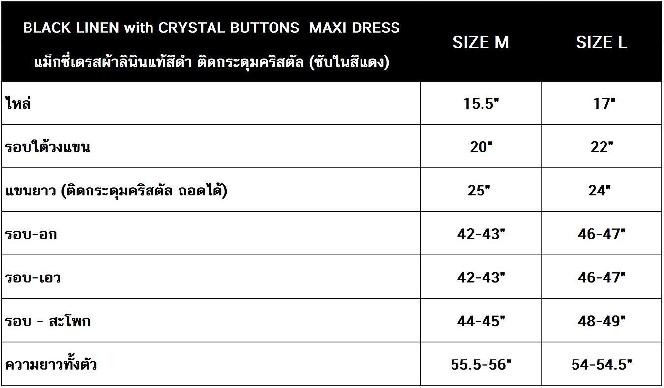 แม็กซี่เดรสทรงโคร่ง (ไม่เข้ารูป) ทรงเอนิดๆ ผ้าลินินแท้สีดำ (แต่รีดง่าย) คอตั้งทรงสูง ติดกระดุมคริสตัลทรงโอเวอร์ไซส์ วงรีเม็ดใหญ่ ช่วงหน้าอกตีเกล็ดวางเฉลียงสวยๆ แบบซ่อนตะเข็บ (เย็บมือ) แขนยาวดีไซน์เก๋ๆ แบบจับจีบไขว้ทบกัน โชว์ด้านติดกระดุมคริสตัลทรงกลม (ถอดออกได้)