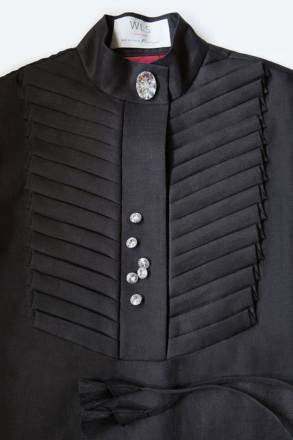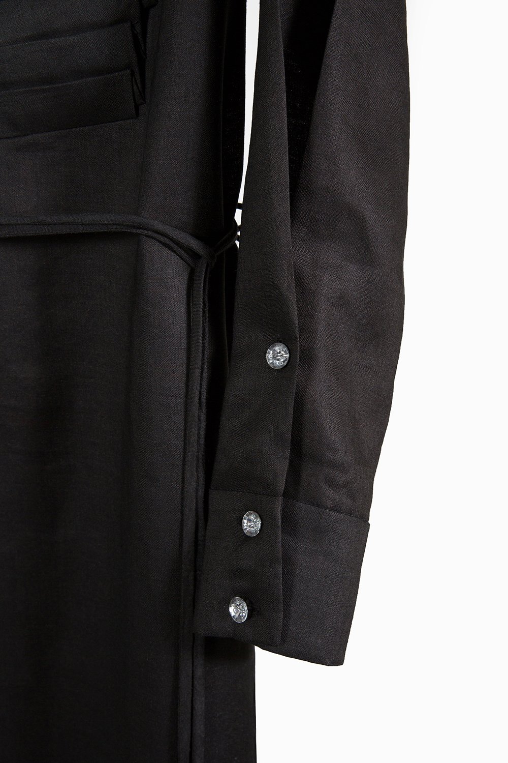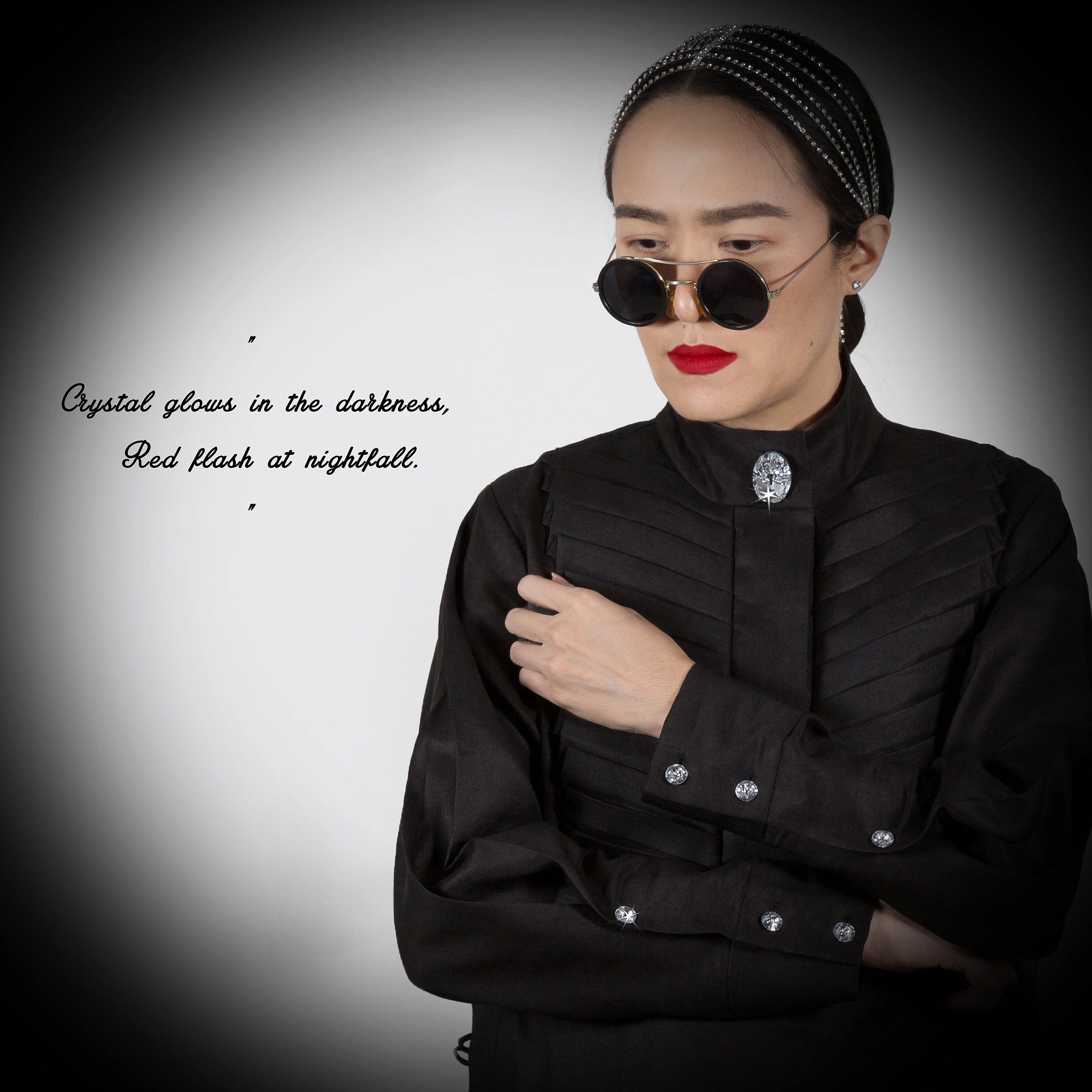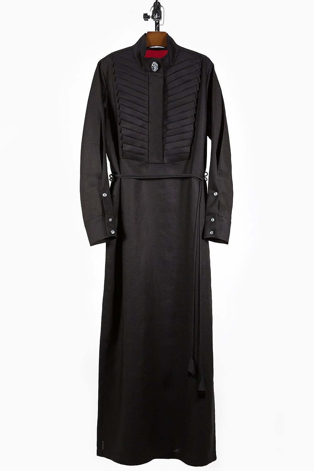 แม็กซี่เดรสทรงโคร่ง (ไม่เข้ารูป) ทรงเอนิดๆ ผ้าลินินแท้สีดำ (แต่รีดง่าย) คอตั้งทรงสูง ติดกระดุมคริสตัลทรงโอเวอร์ไซส์ วงรีเม็ดใหญ่ ช่วงหน้าอกตีเกล็ดวางเฉลียงสวยๆ แบบซ่อนตะเข็บ (เย็บมือ) แขนยาวดีไซน์เก๋ๆ แบบจับจีบไขว้ทบกัน โชว์ด้านติดกระดุมคริสตัลทรงกลม (ถอดออกได้)