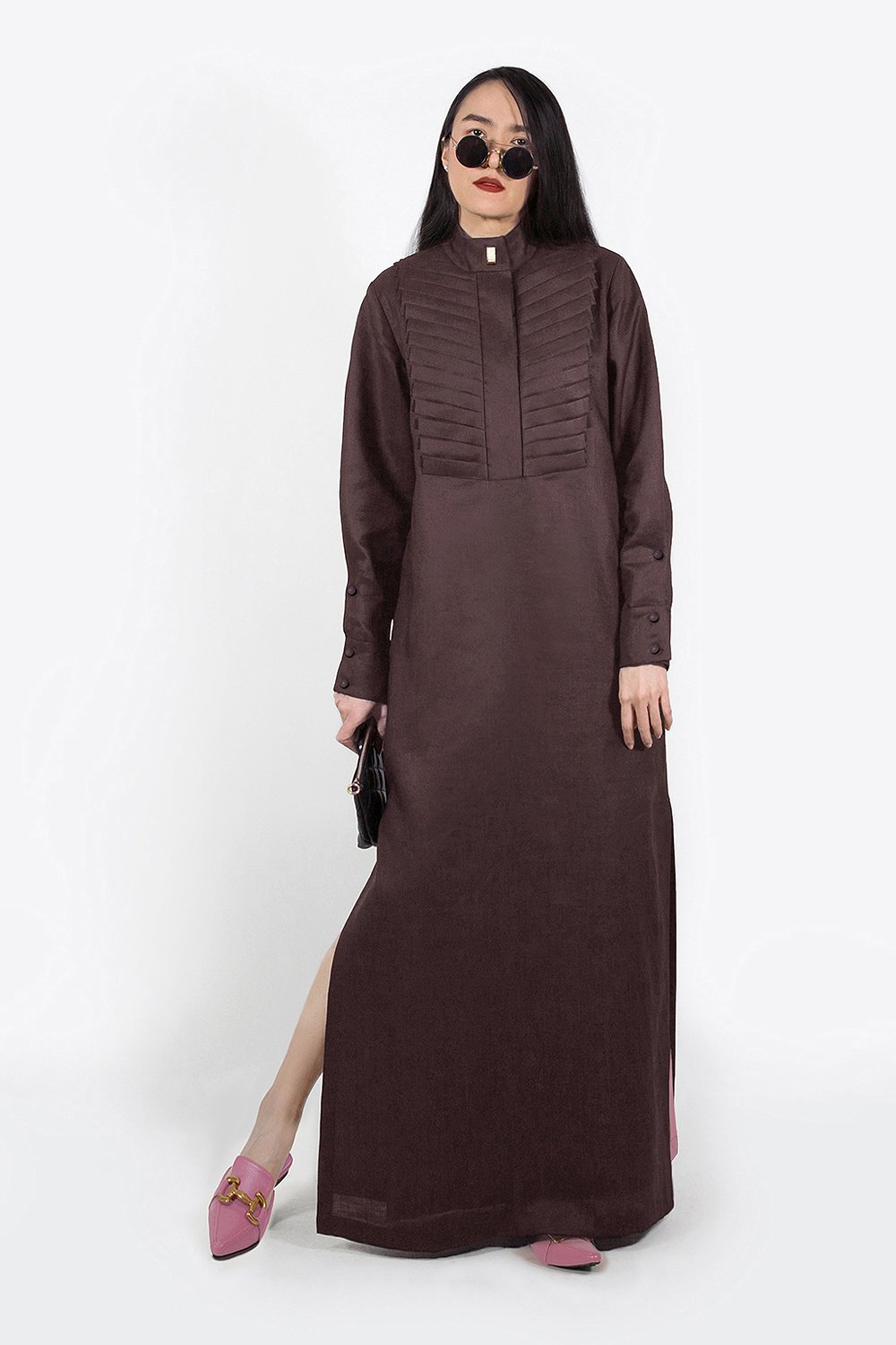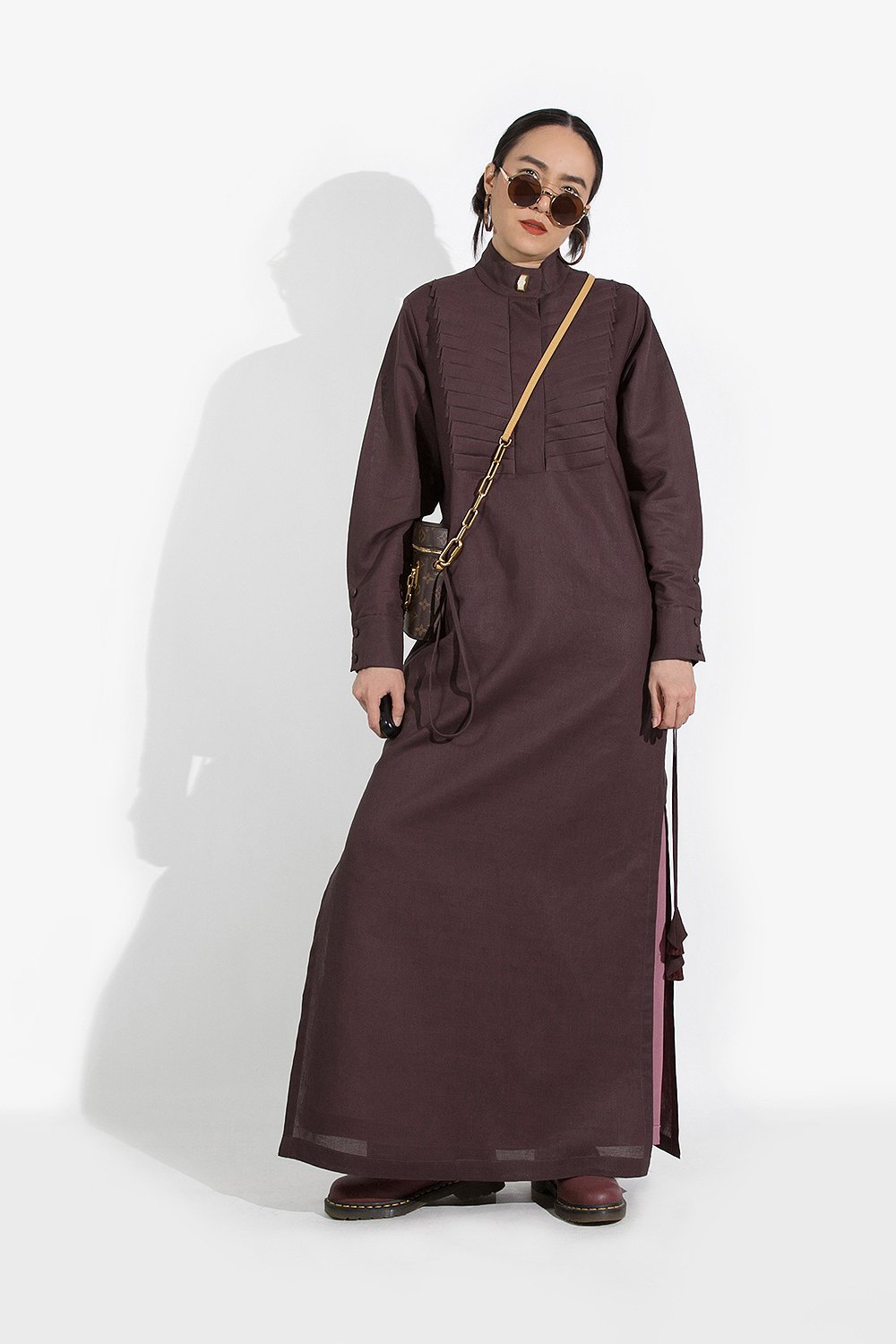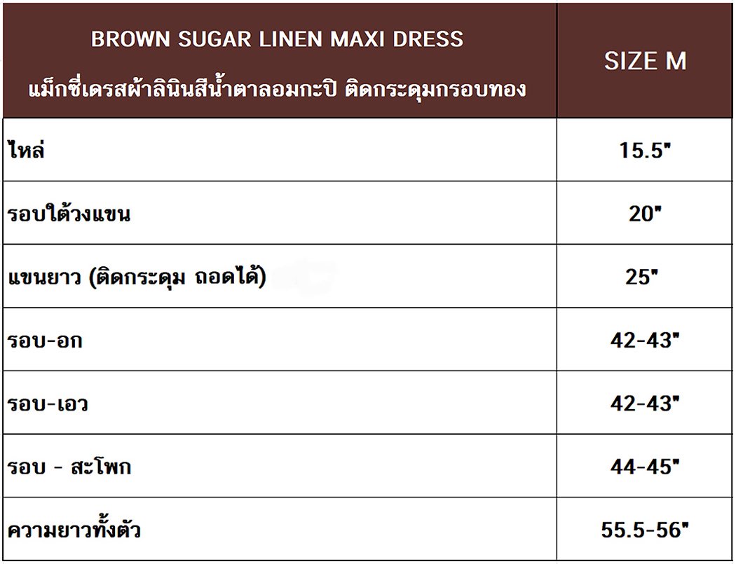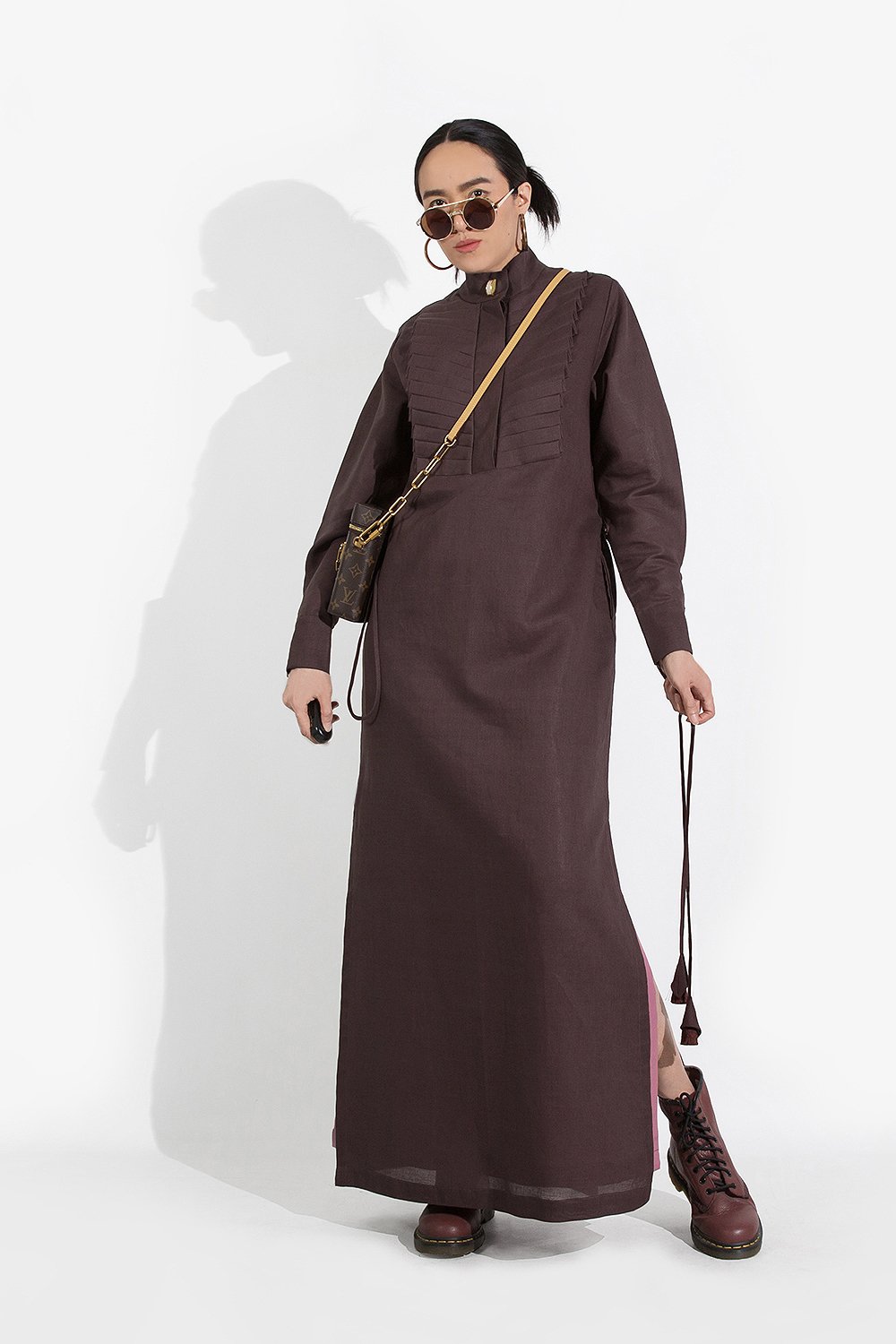 แม็กซี่เดรสทรงโคร่ง (ไม่เข้ารูป) ทรงเอนิดๆ ผ้าลินินเนื้อบาง ใส่สบาย (รีดง่าย) สีน้ำตาลออกกะปินิดๆ มีความแอบอมม่วงหน่อยๆ ใส่ซับในโทนสีชมพูกะปิ เข้ากัน ทำให้ดูแอบหวาน (ไม่แก่) คอตั้งทรงสูง ติดกระดุมมุกวินเทจกรอบทองทรงสี่เหลี่ยมยาวเม็ดใหญ่ ช่วงหน้าอกตีเกล็ดวางเฉลียง แบบซ่อนตะเข็บ (เย็บมือ)