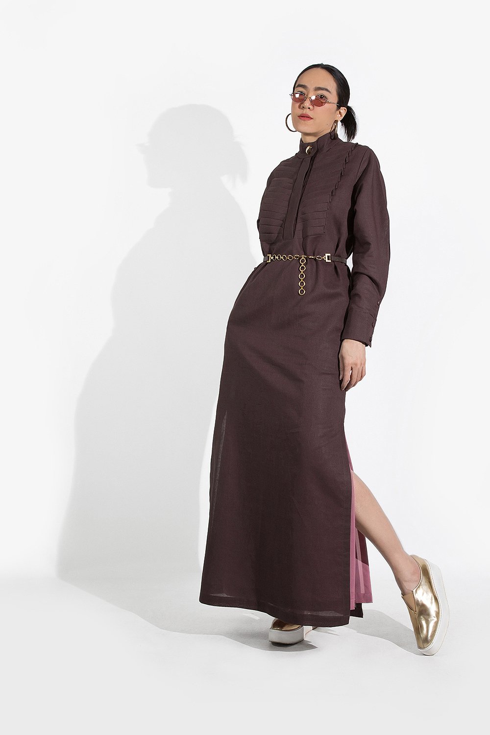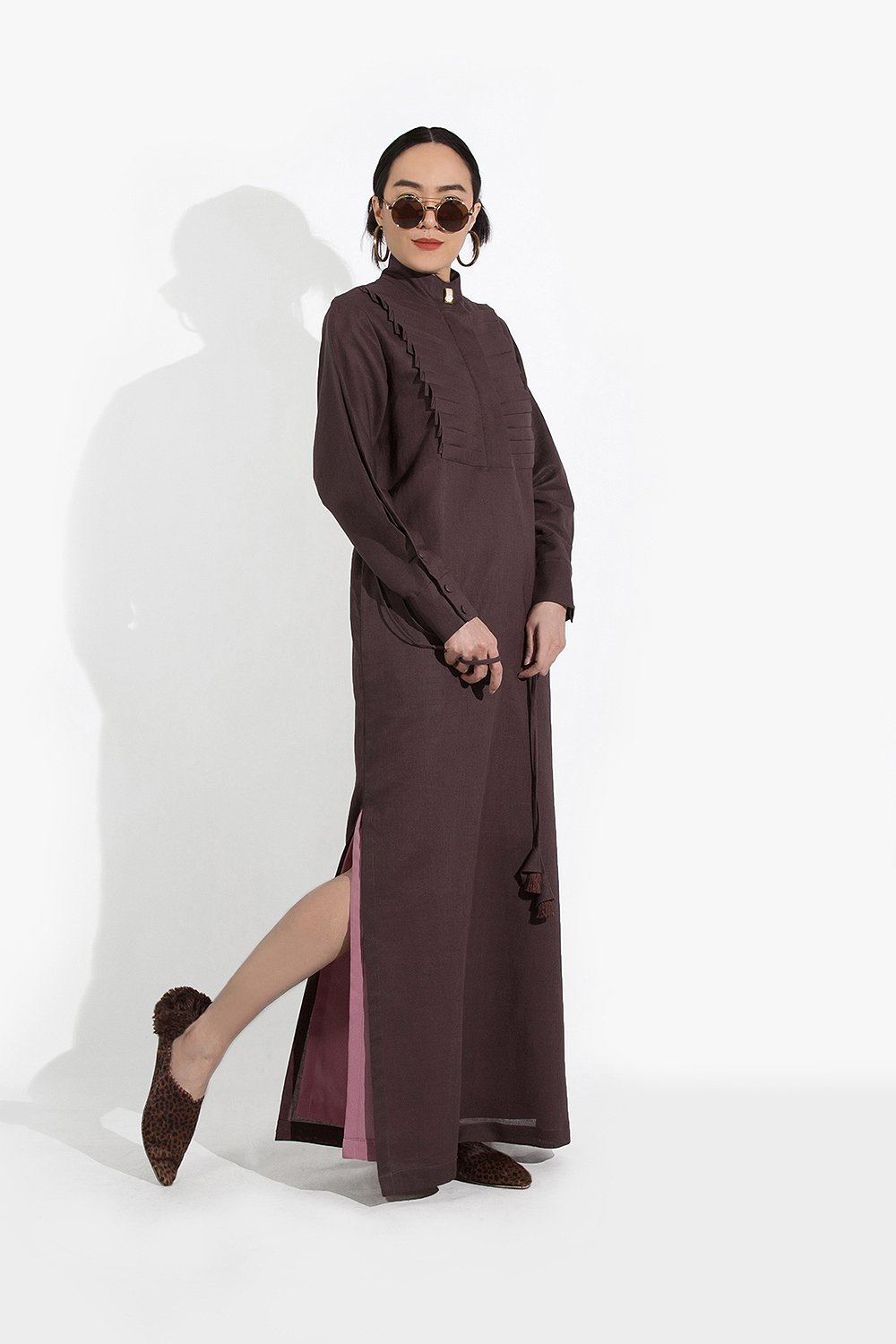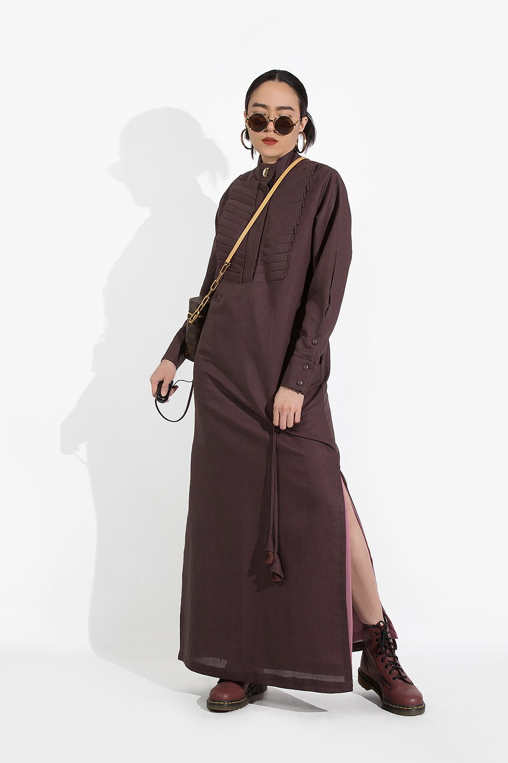 แม็กซี่เดรสทรงโคร่ง (ไม่เข้ารูป) ทรงเอนิดๆ ผ้าลินินเนื้อบาง ใส่สบาย (รีดง่าย) สีน้ำตาลออกกะปินิดๆ มีความแอบอมม่วงหน่อยๆ ใส่ซับในโทนสีชมพูกะปิ เข้ากัน ทำให้ดูแอบหวาน (ไม่แก่) คอตั้งทรงสูง ติดกระดุมมุกวินเทจกรอบทองทรงสี่เหลี่ยมยาวเม็ดใหญ่ ช่วงหน้าอกตีเกล็ดวางเฉลียง แบบซ่อนตะเข็บ (เย็บมือ)