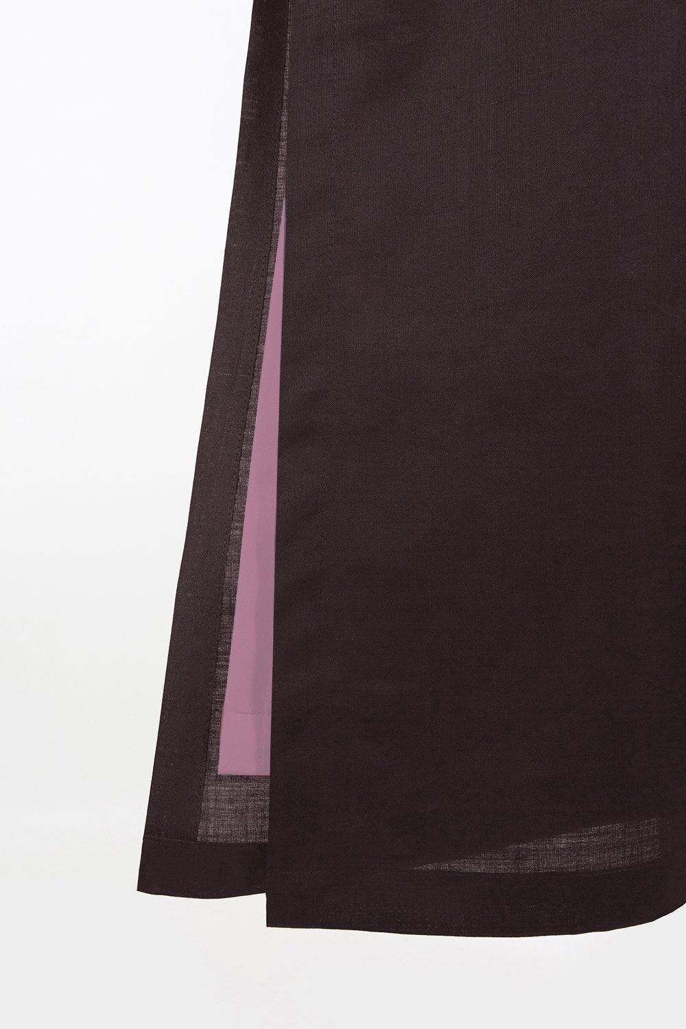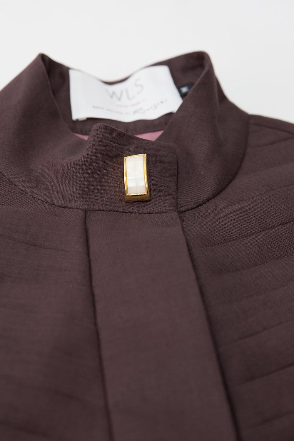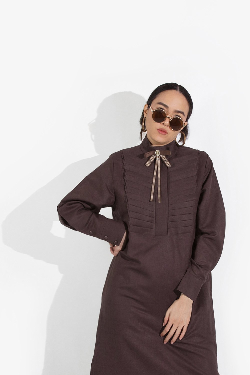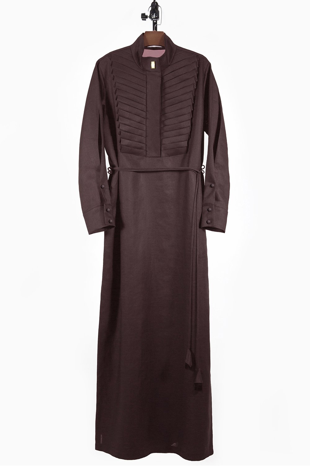 แม็กซี่เดรสทรงโคร่ง (ไม่เข้ารูป) ทรงเอนิดๆ ผ้าลินินเนื้อบาง ใส่สบาย (รีดง่าย) สีน้ำตาลออกกะปินิดๆ มีความแอบอมม่วงหน่อยๆ ใส่ซับในโทนสีชมพูกะปิ เข้ากัน ทำให้ดูแอบหวาน (ไม่แก่) คอตั้งทรงสูง ติดกระดุมมุกวินเทจกรอบทองทรงสี่เหลี่ยมยาวเม็ดใหญ่ ช่วงหน้าอกตีเกล็ดวางเฉลียง แบบซ่อนตะเข็บ (เย็บมือ)